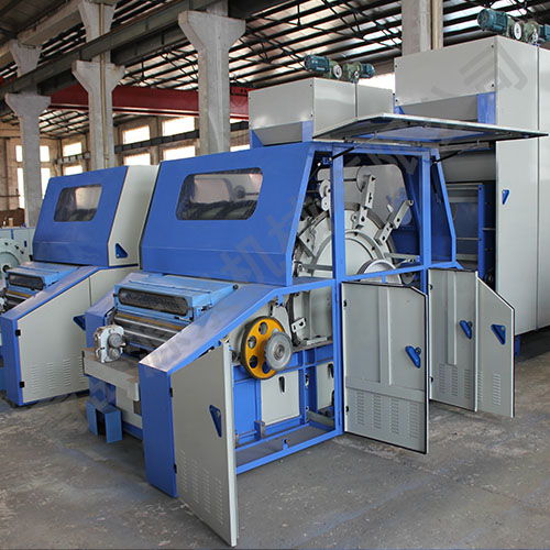 本機(jī)主要適用于山羊絨、兔絨、牦牛絨、蠶絲、化纖等散纖維,適紡纖維長(zhǎng)度為16-80mm。將電子稱重喂毛機(jī)均勻送來(lái)的纖維層進(jìn)行開(kāi)松和梳理,使所有呈卷曲,塊狀的纖維理成基本伸直的單纖維狀態(tài),后經(jīng)剝網(wǎng)圈條供后道工序使用。